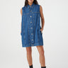 Our versatile sleeveless dress. Goldie features elongating vertical bodice seams, deep side pockets and endless styling options. Crafted in our newest 10.5oz organic cotton rigid denim.